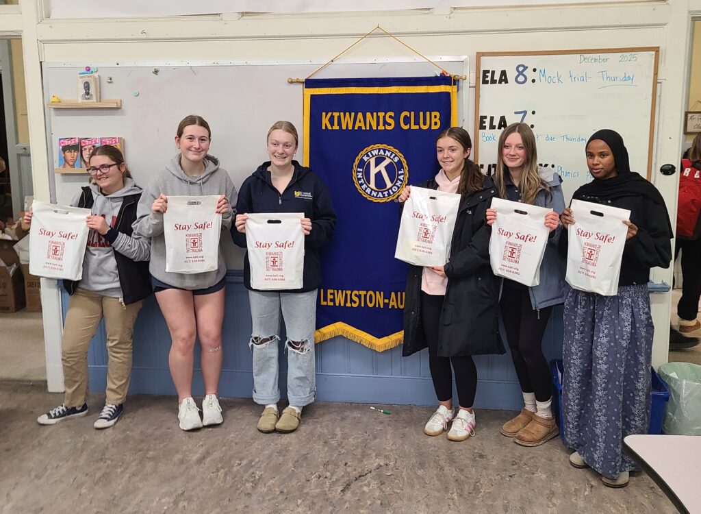 Our club, along with our sponsored Key Clubs at Leavitt Area High School, Lewiston High School and Oxford Hills Comprehensive High School, a Key Club being organized at Edward Little High School, and our sponsored Builders Club at St. Dominic Academy, put together 500 Early Childhood Injury Prevention packets (“Baby Bags”) recently. They look like this.